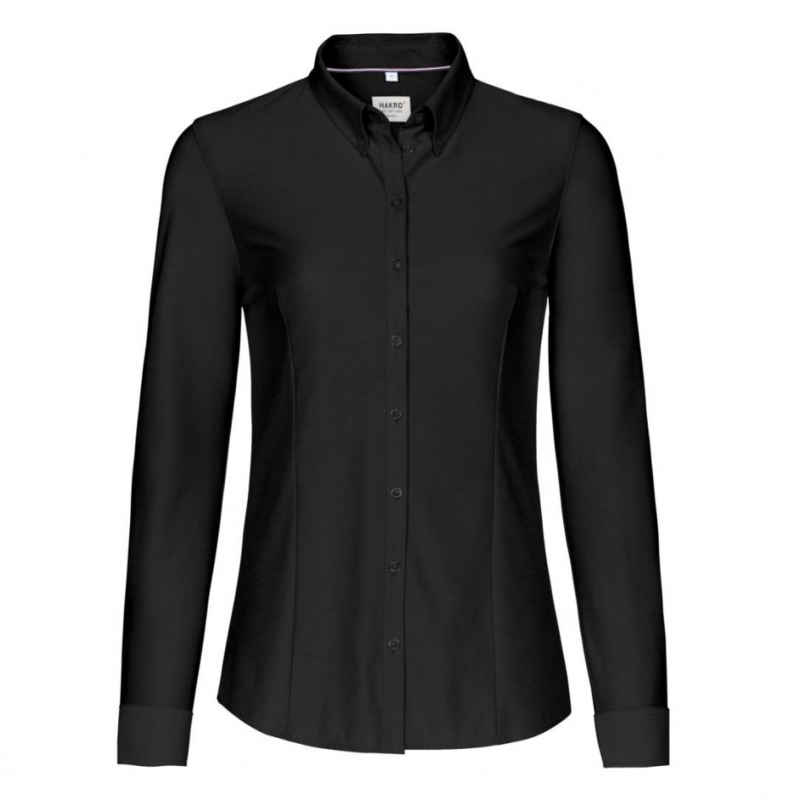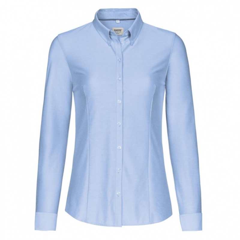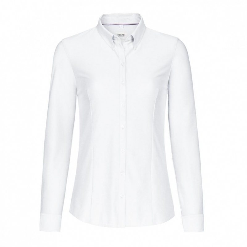 Art 129 dames blouse gebreid p.q. lange mouwen en button down, licht getailleerd d.m.v. coupenaden achter en afgeronde onderkant .Kraag aan de binnenkant gevoerd met satijn. Schouderstukken dubbel Kleine elegante plaket voor en verstelbare manchetten. Knopen met vier gaten en kruislings gestikt en geknoopt, vast en zeker, Reserveknoop en de zijnaden extra verstevigd gestikt. Dubbel gestikte zijnaden, sterk. De dames bloes heeft een extra 2 coupenaden voor maar de heren uitvoering heeft deze niet. Onderhoudsvriendelijke gebreide katoen polyester, bijna strijkvrij, licht bijstrijken, zacht maar ook oersterk en stretch. Optimaal draagcomfort door de stretch en het zacht aanvoelende materiaal. Zorgeloos en sterk .Geweven HAKRO neklabel van hoge kwaliteit in zacht satijn en ergonomische vorm voor draagcomfort HAKRO kwaliteit en wasvoorschriften label in de binnen zijnaad.